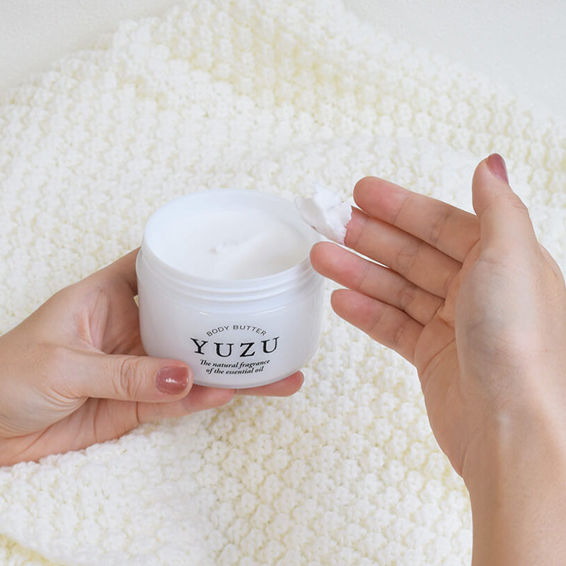 人肌でじんわり溶けるシアバター*1で濃密保湿。厳選された高知県産ユズ精油の爽やかな香り。高知県産ユズ精油*2のみで香りづけをしたボディバター。人肌でじんわり溶けるバターのような濃密保湿は乾燥対策にオススメのアイテムです。 ユズ種子油などの8種のボタニカルオイルがお肌にうるおいを与え、なめらかな肌に導きます。